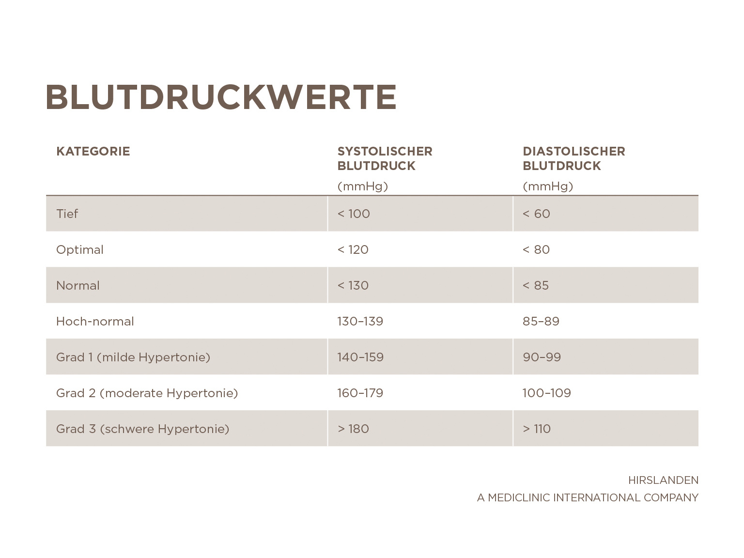 Blutdruckwerte von maximal 120/80 im Ruhezustand gelten bei erwachsenen Männern und Frauen als ideal. Ein normaler Blutdruck liegt üblicherweise bei einem systolischen Wert unter 140 mmHg und einem diastolischen Wert unter 90 mmHg, wobei allerdings ein Messwert über 129/84 bereits als hoch-normal bezeichnet wird. Ist der Blutdruck über einem Wert von 159/99, liegt bereits eine leichte Hypertonie vor. Diese muss medizinisch abgeklärt werden, um Folgeschäden zu vermeiden.