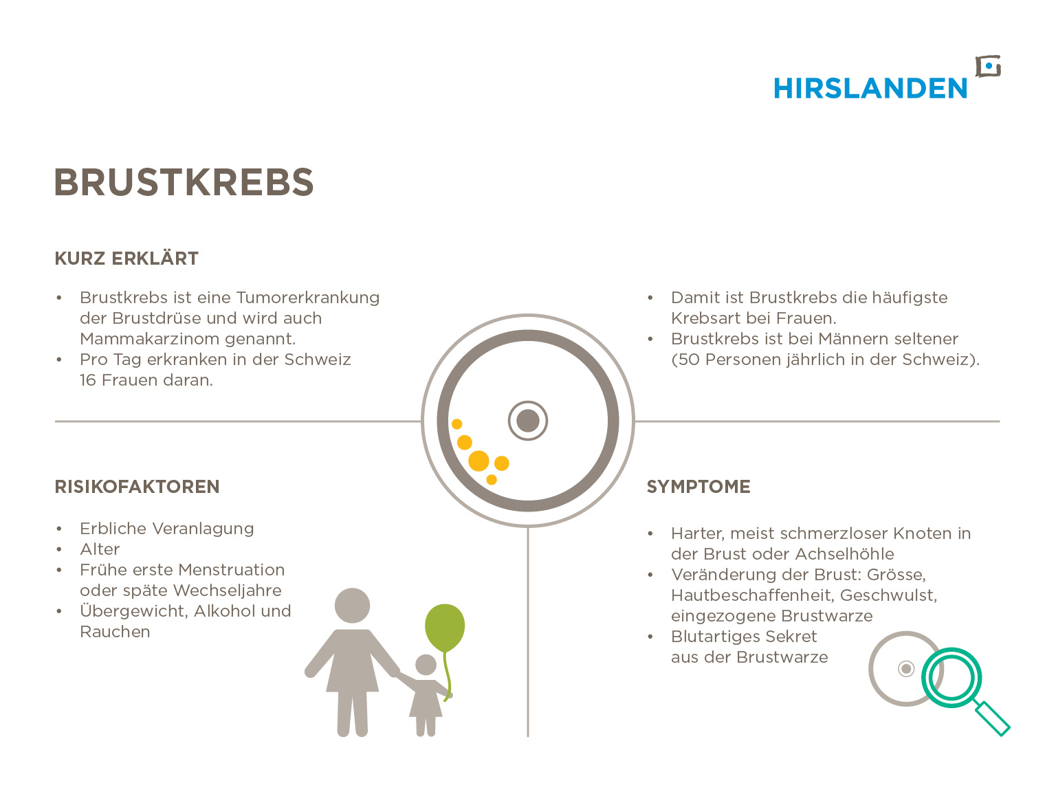 Die genauen Ursachen, warum ein Brustkrebs entsteht, sind weitgehend unbekannt. Familiäre Veranlagung, Kinderlosigkeit, Hormonersatztherapie während den Wechseljahren oder Übergewicht sind Faktoren, die mit einem erhöhten Risiko für Brustkrebs verbunden sind. Bei Häufung von Brustkrebs in der Familie sollte eine genetische Untersuchung stattfinden. Frauen, die eine Mutation auf den BRCA1- oder BRCA2-Genen tragen, weisen ein sehr hohes Risiko auf.