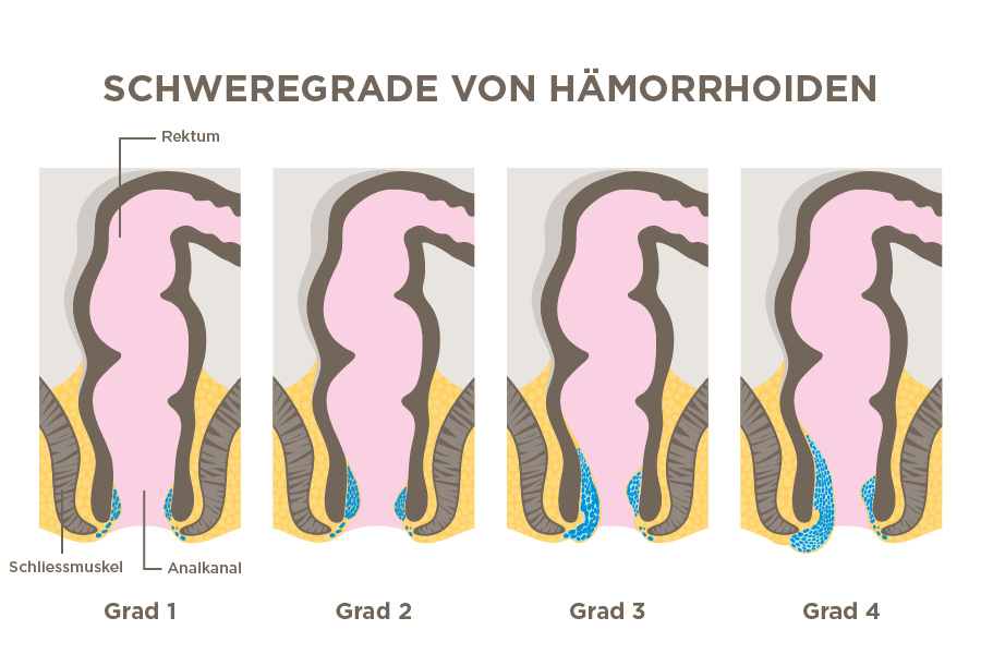 Hämorrhoiden werden in vier Schweregrade eingeteilt, die den Grad der Erkrankung und die damit verbundenen Symptome widerspiegeln: