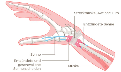 Sehnenscheidenentzündungen treten häufig an Daumen (Tendovaginitis de Quervain), Handgelenken, Armen und Füssen auf und entstehen in der Regel durch eine langfristige und chronische Überbelastung der Sehnen. Seltener kann sie jedoch auch infolge einer bakteriellen Infektion oder durch rheumatische Erkrankungen ausgelöst werden: