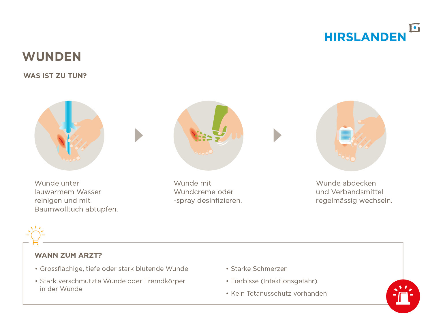 | 3. Wunde abdecken | Decken Sie die Wunde ab, beispielsweise mit einem Pflaster, damit keine Keime in die Wunde gelangen. Wechseln Sie das Verbandsmittel regelmässig während der Wundheilung. |