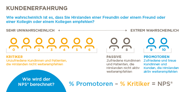 Mit dem sogenannten Net Promoter Score (NPS) messen wir regelmässig, wie wahrscheinlich es ist, dass unsere Patient*innen und Kund*innen Hirslanden weiterempfehlen.