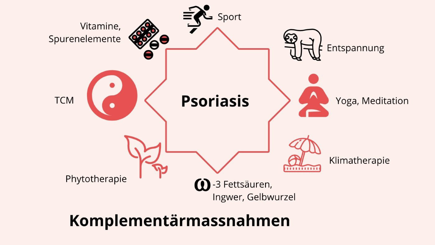 Fakt #7: Mittlerweile gibt es Studiendaten zum Einsatz von Psychotherapieverfahren wie Hypnose, Suggestion, Meditation und gar Yoga als Begleitmassnahmen in der Psoriasis-Therapie (Zusammenfassung verschiedener unterstützender Therapien in Abb. 6). Nicht überraschend sind die positiven Resultate, welche verzeichnet werden konnten. Einerseits erzielt die Ausübung von Achtsamkeit und Konzentration einen verbesserten Umgang mit Stress mit daraus folgender Entspannung. Anderseits steigert der Patient dadurch die Compliance (Befolgen der Therapie), übernimmt mehr Selbstverantwortung, stärkt das Selbstwertgefühl und schafft somit ein angenehmeres Umfeld für die Genesung. Dies alles fördert die Wahrnehmung und Akzeptanz des eigenen Körpers und mobilisiert die Eigenheilkräfte. Nicht zuletzt wirken sich regelmässige Bewegung und die Vermeidung von Stress positiv auf das metabolische Syndrom aus.