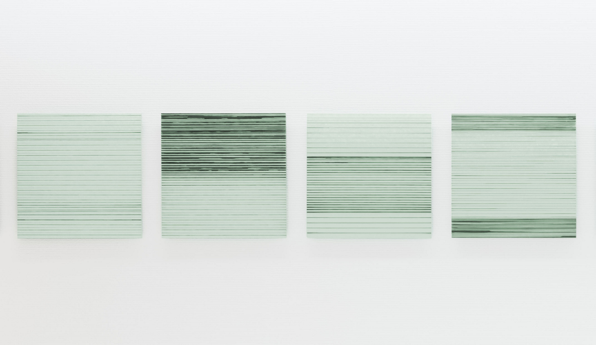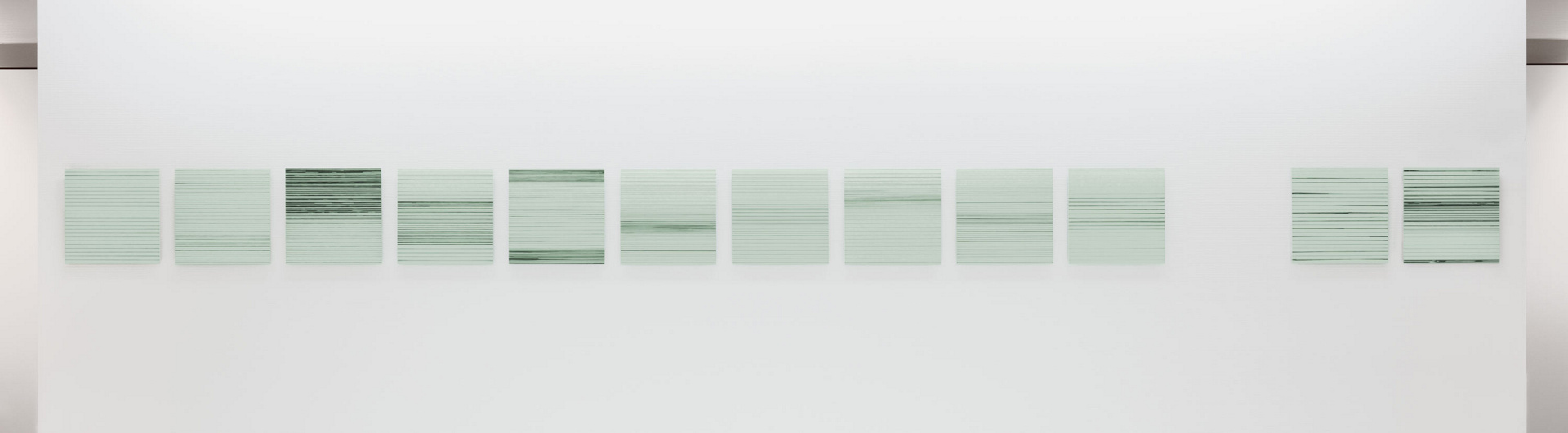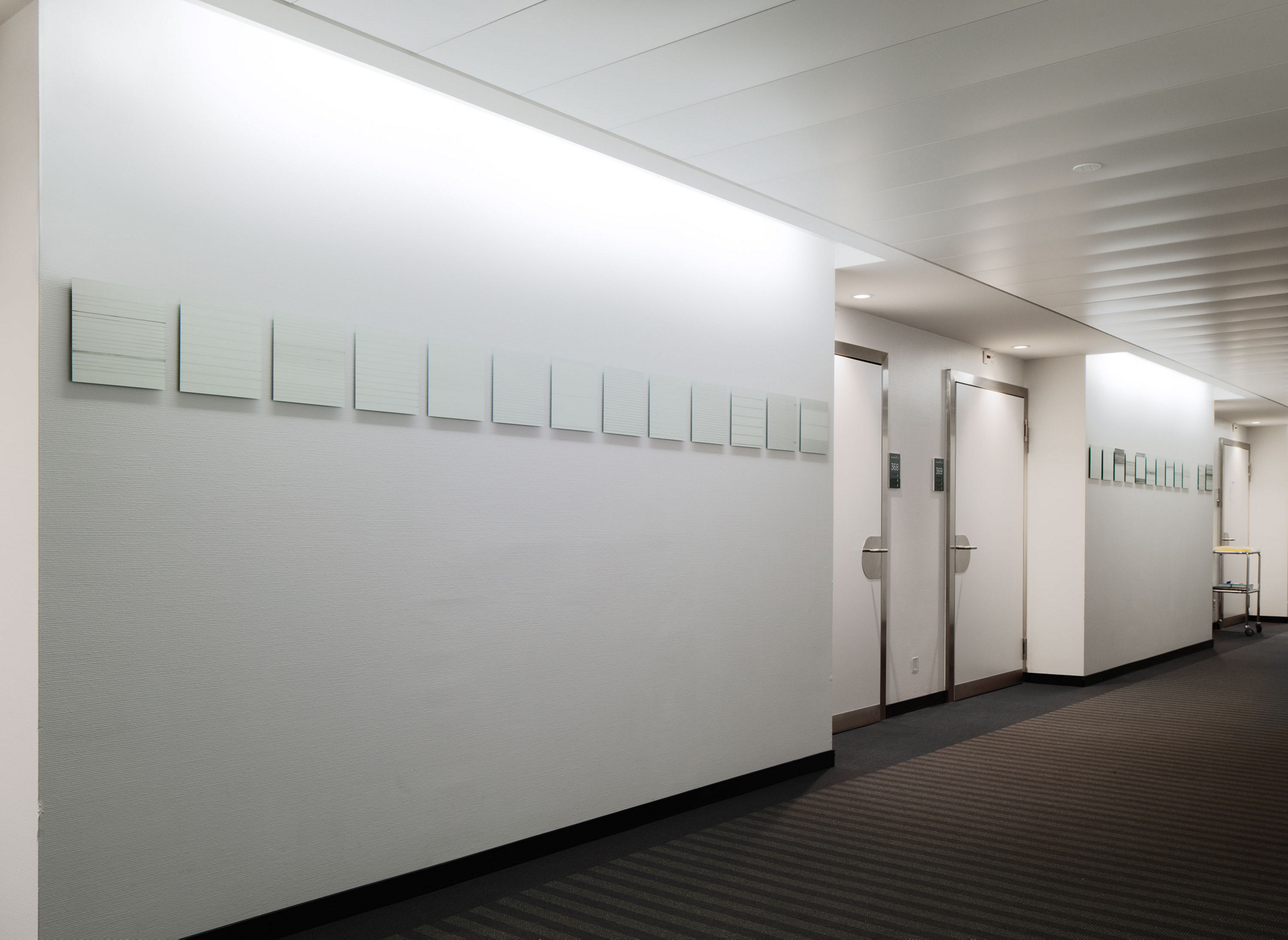 Yvonne Huggenbergers Bilderzyklus „Between Light and Dark“ zieht sich wie ein roter Faden durch den langen Korridor und wirkt durch seine reduzierte Farbigkeit sehr zurückhaltend und unaufdringlich. Es handelt sich um 116 Spiegelplatten im Format von 25 auf 25 Zentimetern, auf welchen die Künstlerin in einem langwierigen Entstehungsprozess unzählige Linien von Hand mit der Feder oder dem Tuschstift gezogen hat. Nicht immer sind die Linien komplett durchgezogen, oft sind sie unterbrochen, gepunktet oder gestrichelt und geben den Blick frei auf den transparenten Untergrund.