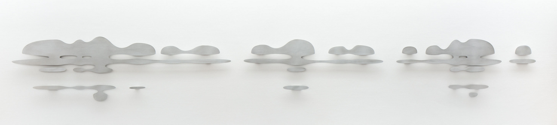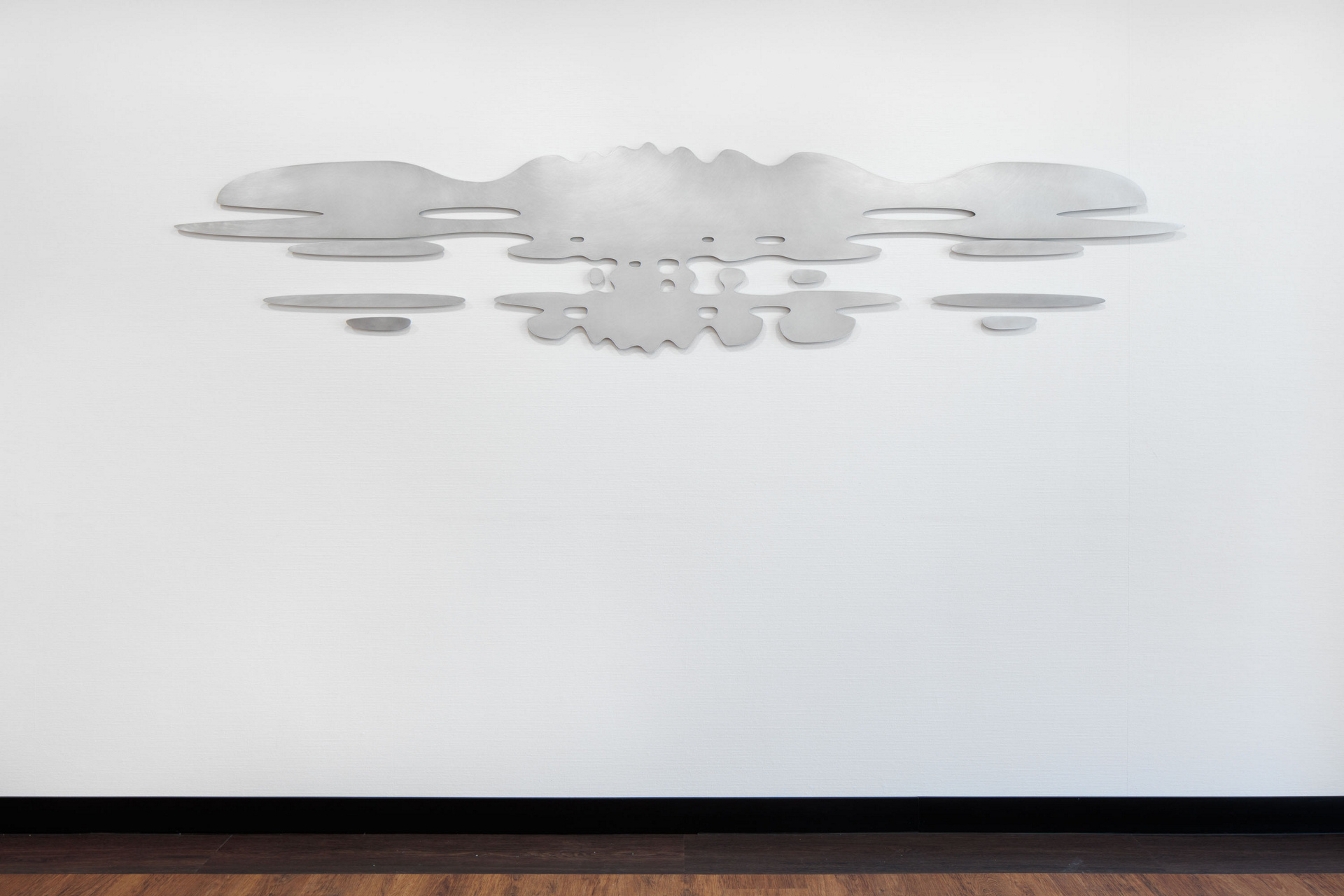 Längliche, amorph wirkende Partikel aus Aluminiumblech erstrecken sich entlang einer imaginären Horizont-Linie auf der westlichen Wand des Korridors.