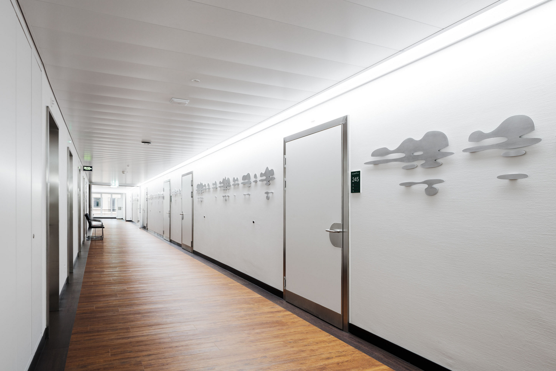 „Dem Projektvorschlag liegt das Anliegen zugrunde, den durch Türen und Mobiliar unruhig wirkenden Korridor zu beruhigen und als zusammenhängenden Raum erlebbar zu machen. Der Ort soll eine wohltuende Weite aufweisen und den Nutzerinnen und Nutzern bereichernde Assoziationen ermöglichen. Die Arbeit soll sich dem Betrachter nicht aufdrängen, ihn aber immer wieder zu neuen Lesarten verführen.