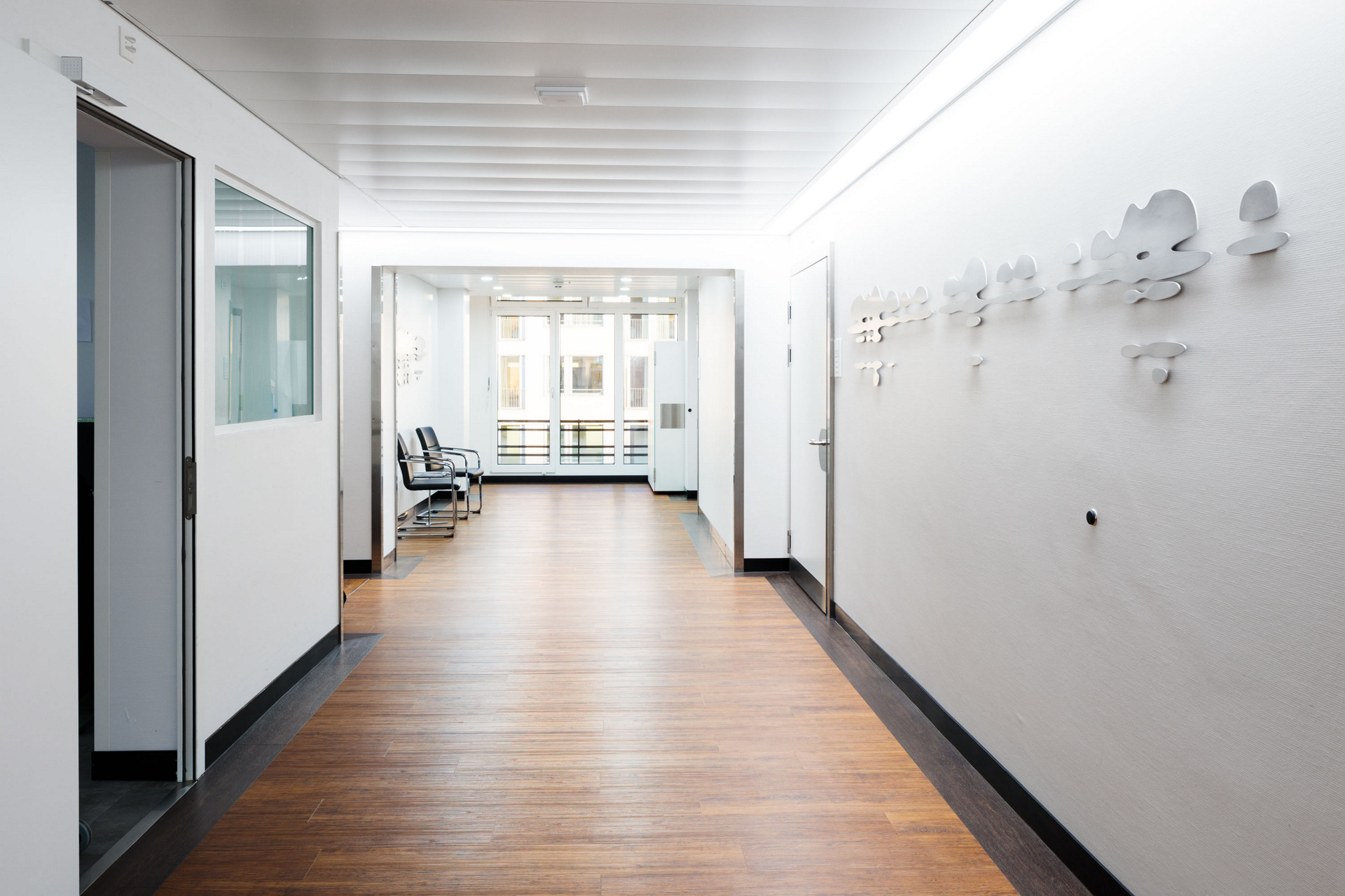 Kurz vor dem südlichen Ende des Korridors wechseln die Partikel auf die gegenüberliegende Wandseite. Die unterschiedlich grossen, plastischen Elemente binden, die durch mehrere Türen unterbrochene Wand, zu einer Einheit zusammen, welche beim Abschreiten erlebbar wird. Dabei können sich vielfältige Vorstellungen wie die einer hügeligen Landschaft, eines sanften Wellenschlags oder einer Abfolge von rätselhaften Noten- oder Schriftzeichen einstellen.“
