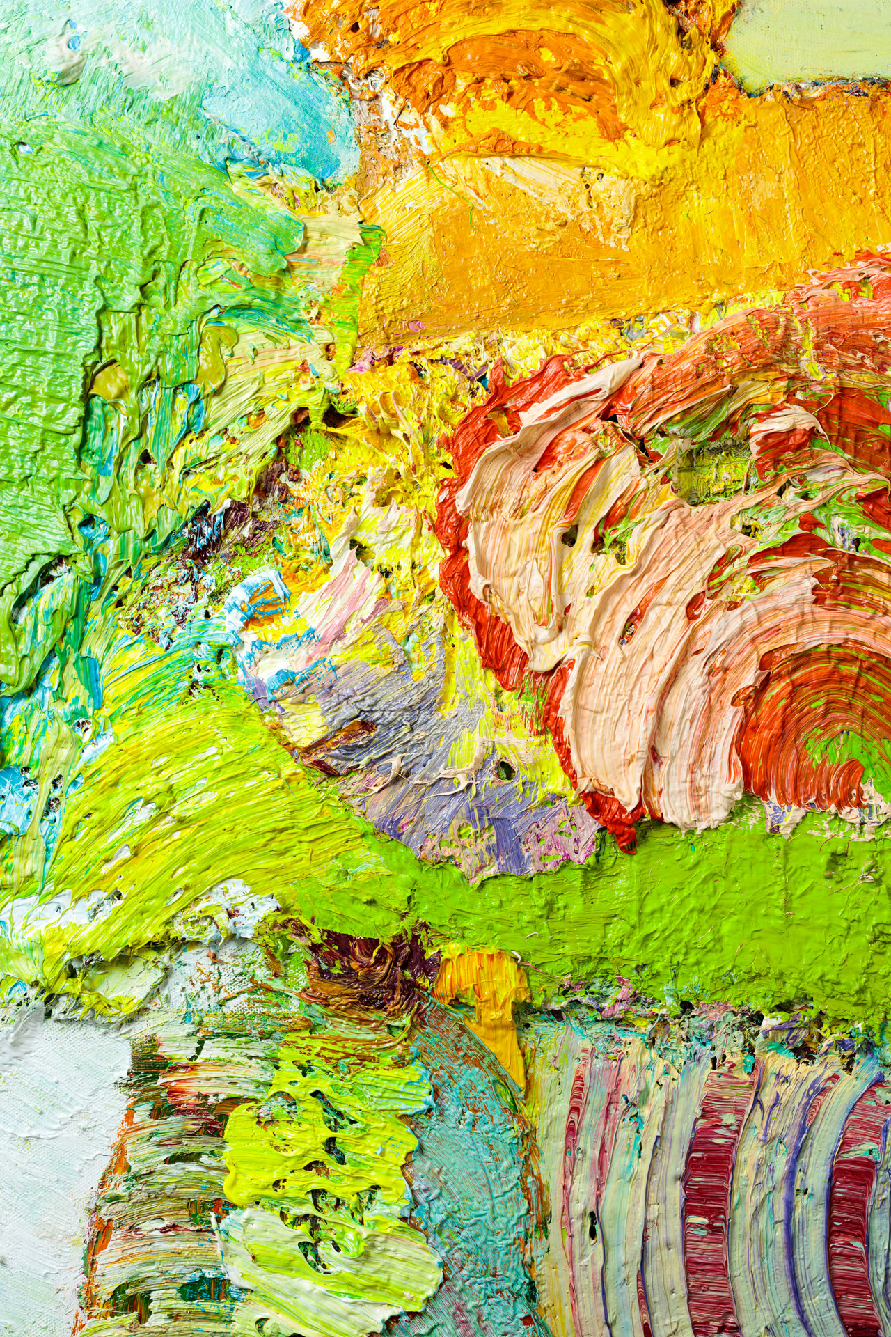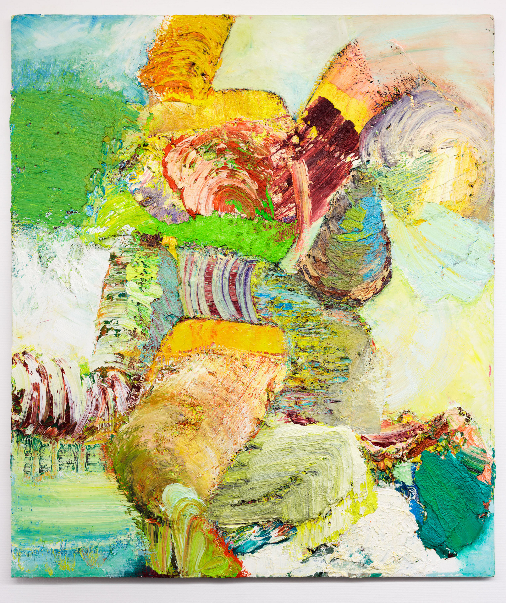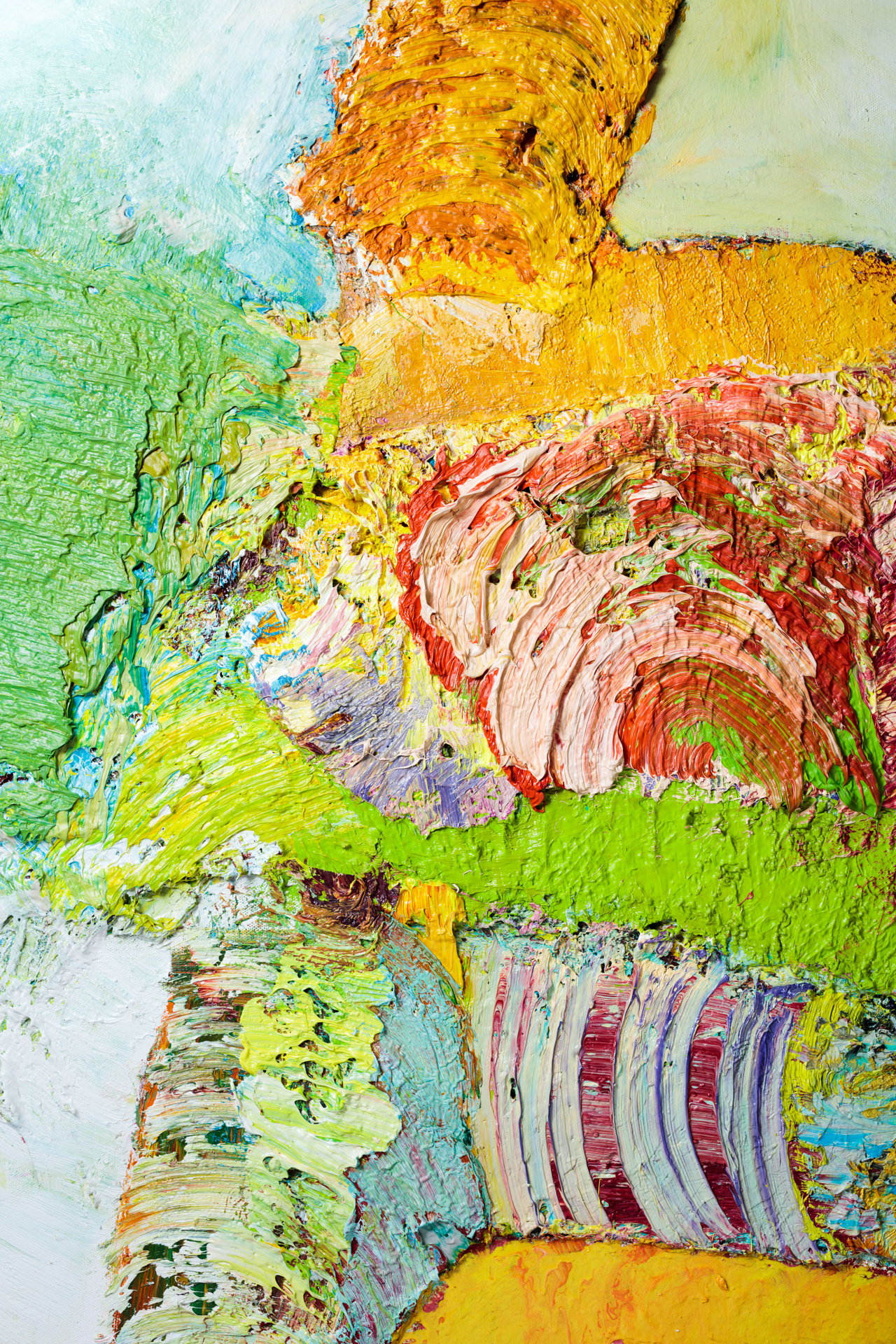 Die differenzierte Oberflächenstruktur wird mit unterschiedlichen Werkzeugen wie Spachtel, Messer, Rechen und Pinsel bearbeitet und lässt uns durch die sichtbaren Spuren und Gesten der Hand am Prozess des Malens teilhaben. In den jüngeren Werken werden die vollständig von Farbe eingenommenen Bildträger abgelöst von einer partiellen Auflösung der Schichten, die den kreideweissen Untergrund sichtbar machen und den einzelnen Farbinseln einen zeichenhaften Charakter verleihen.