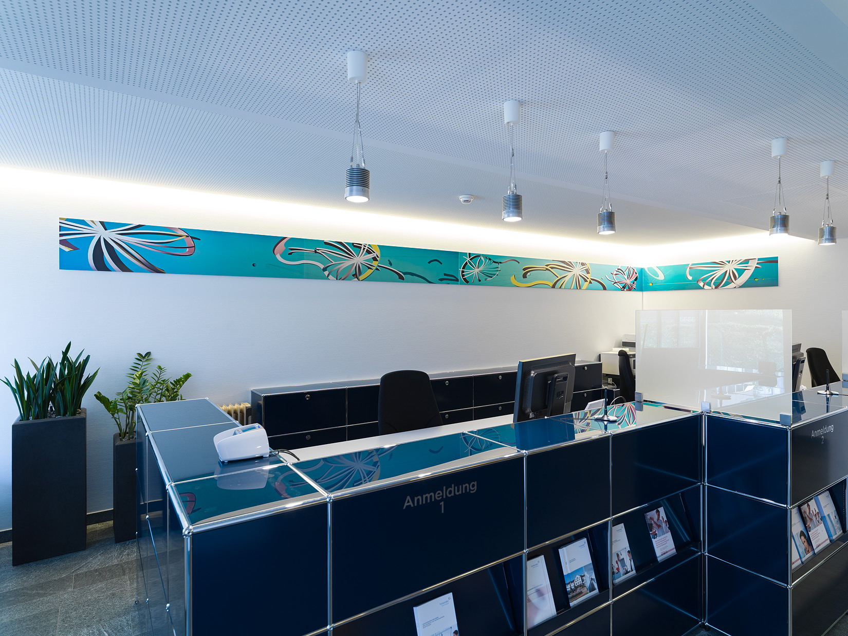 Das architektonische, reliefartige Element einer floralen Rosette zieht sich als Fries durch die gesamte Radiologie der Klinik Hirslanden und verbindet den Empfangs- und Wartebereich über das Treppenhaus mit den Untersuchungsräumlichkeiten im Untergeschoss.