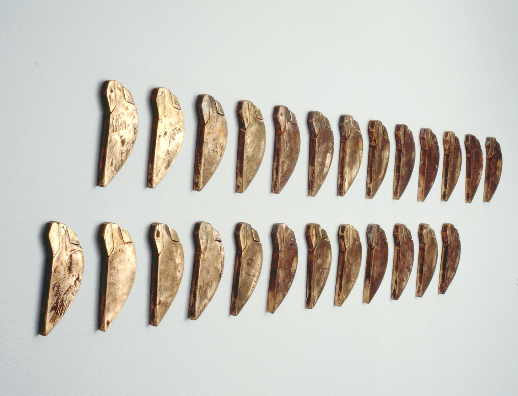 Catherine Lee hat ihre Wandskulptur „Rendering Bronze“ in zwei Reihen untereinander und leicht versetzt in gleichmässigen Abständen voneinander angeordnet. Das minimalistische Werk basiert auf sich wiederholenden Einheiten in einer scheinbar monotonen Anordnung. Auf den ersten Blick erscheinen sie völlig identisch, doch bei genauerer Betrachtung lassen sich in der Binnenstruktur feine Unterschiede ausmachen, als ob sie einer bestimmten Familie oder einem Volksstamm zugehörig wären.