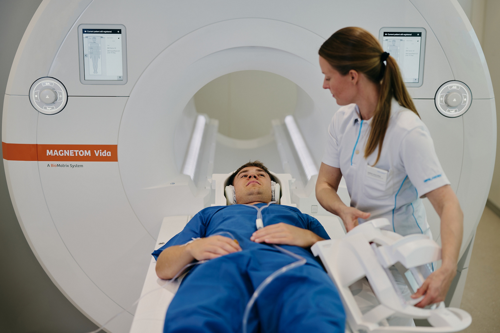 Unsere MRT-Untersuchungen führen wir seit November 2024 mit dem Gerät MAGNETOM Vida der Firma Siemens Healthineers, dem führenden Gerät auf dem Gebiet, durch. Das Gerät zeichnet sich durch das Zusammenspiel von Leistung, Intelligenz und Geschwindigkeit aus. Innovative Bildgebungstechnologien ermöglichen schärfere Bilder, schneller als je zuvor. Durch die BioMatrix-Technologie, welche die Bildgebung durch Antizipierung von Bewegungen und das Anpassen an Anatomien unterstützt, wird ein effizientes und komfortables Erlebnis für unsere Patienten und Patientinnen geschaffen.