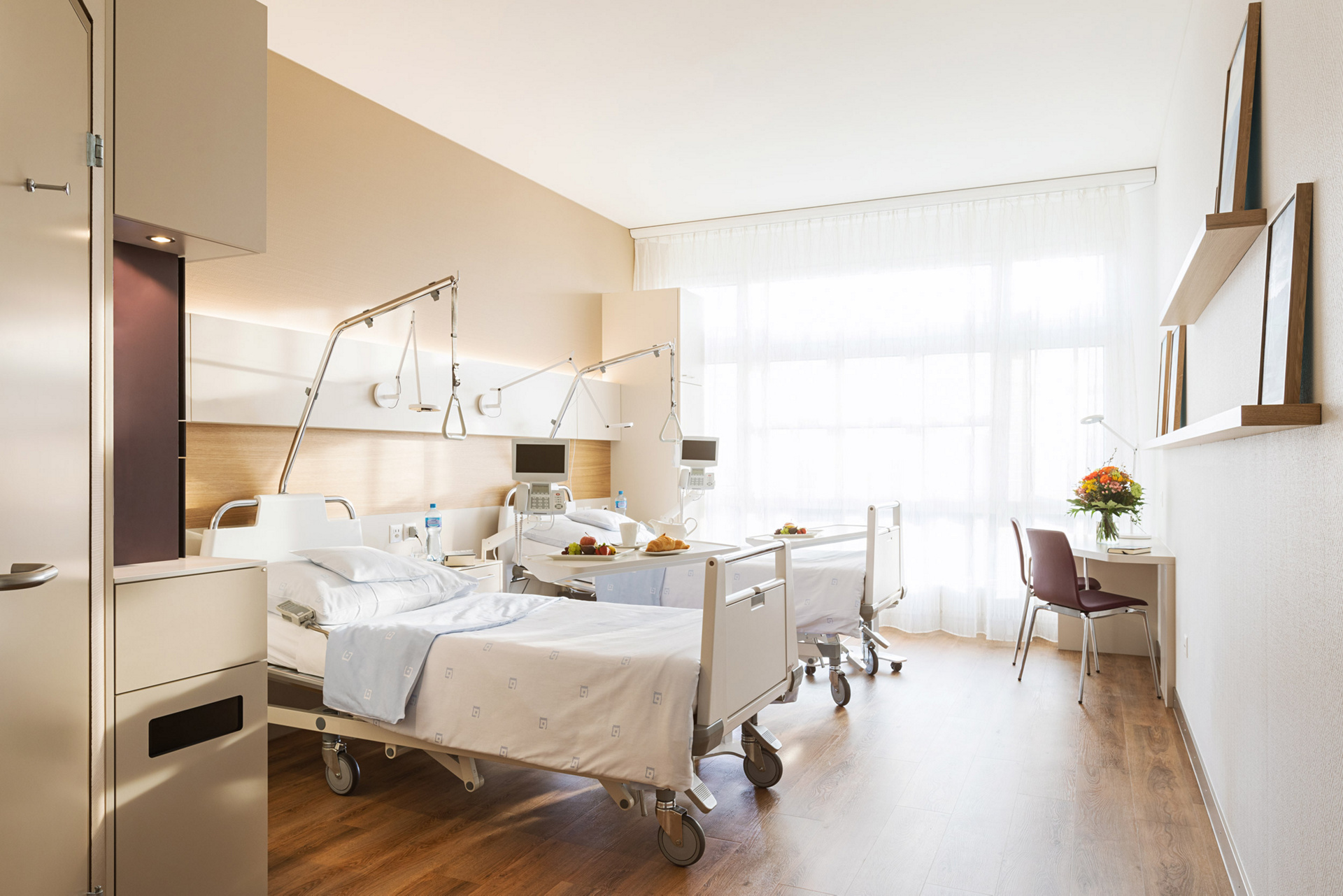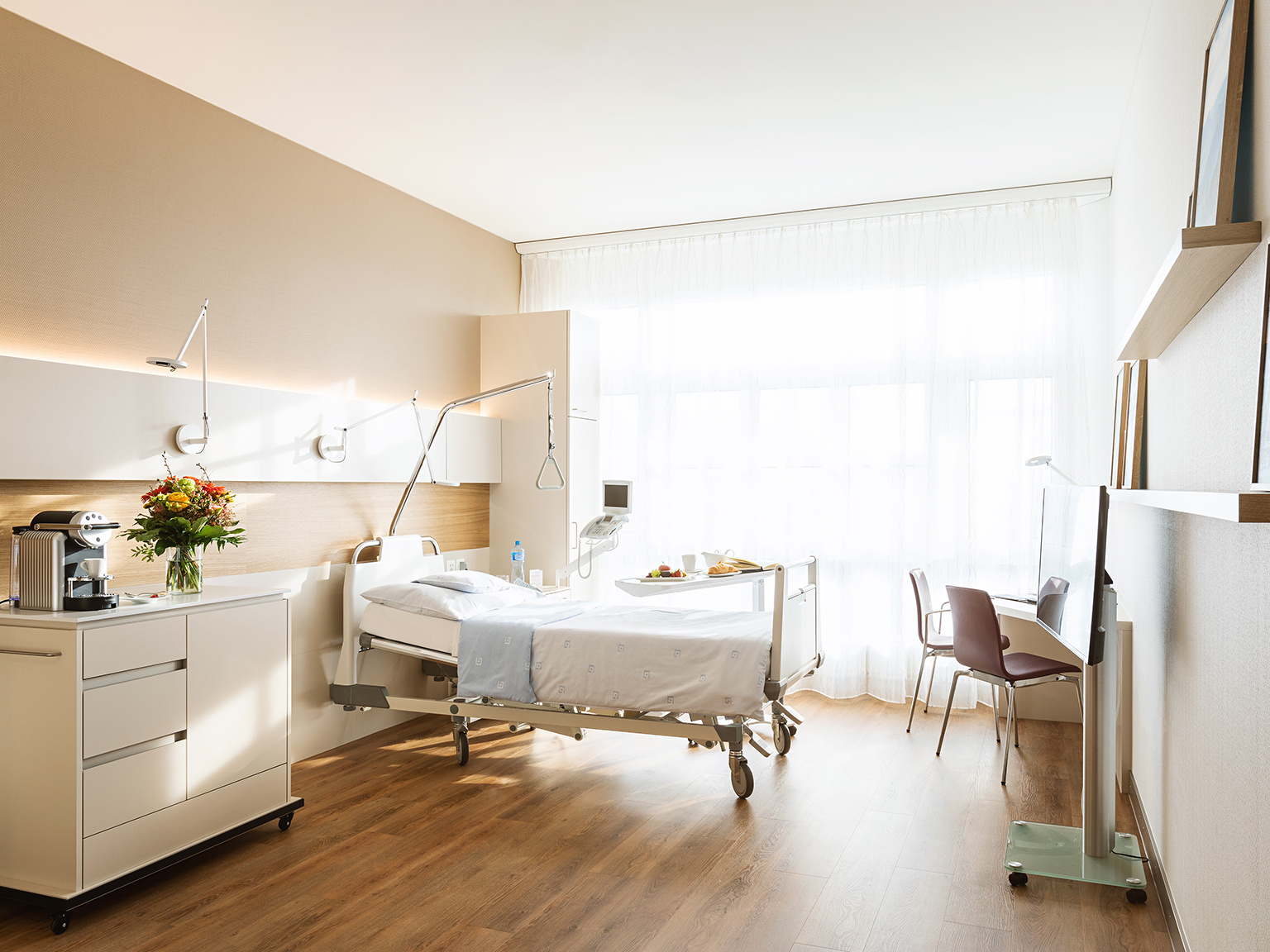 AndreasKlinik Cham Zug has 65 beds, divided into single, double, and four-bed rooms for patients with basic insurance coverage.