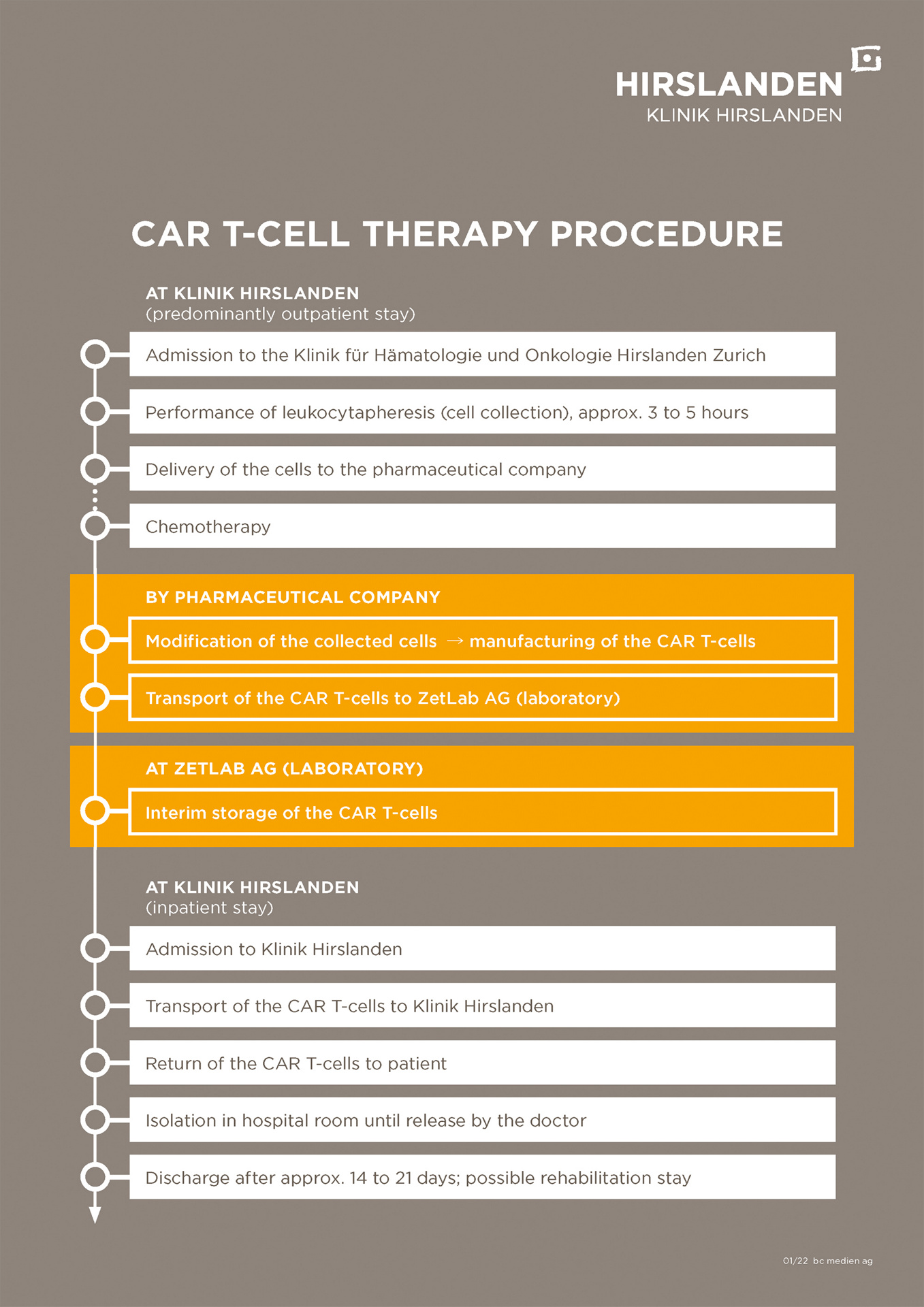 The cells obtained in this way are frozen and sent to specialist laboratories, where they are genetically engineered so the T-cells produce a protein that can recognise and bind to cancer cells. From this point on, they are called CAR T-cells. They are then replicated, tested and sent back to Klinik Hirslanden. This procedure takes up to 27 days.