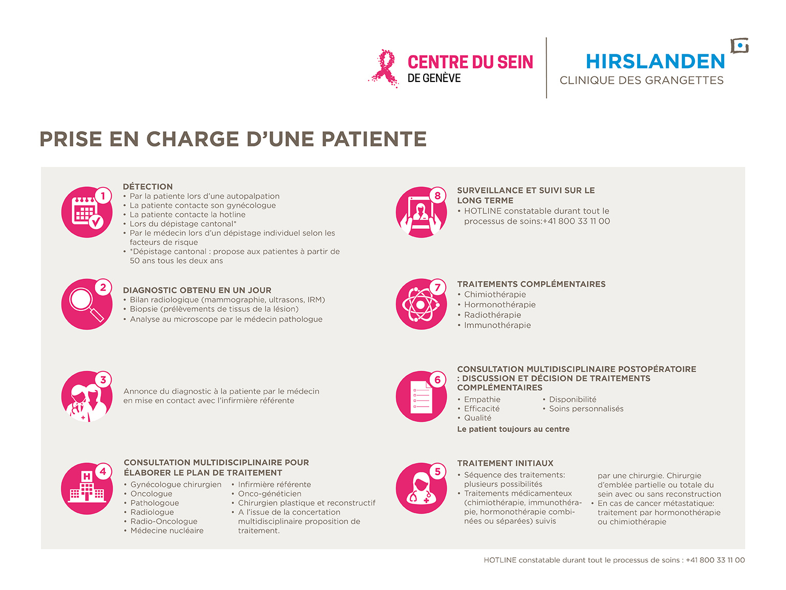 En cas d’hospitalisation, les patientes au bénéfice d’une assurance de base uniquement peuvent aussi être traitées au Centre du sein de Genève et être opérées à la Clinique des Grangettes dans le cadre des quotas qui sont octroyés par l’Etat de Genève.