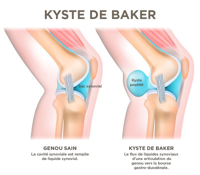 Ces affections entraînent toutes une production accrue de liquide synovial au niveau du genou, qui augmente alors la pression dans l’articulation du genou et provoque, dans certains cas, une protubérance de la capsule articulaire dans le creux poplité.
