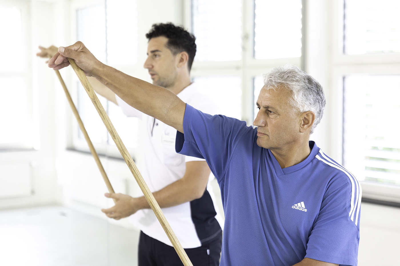 Après la pose d’une prothèse de l’épaule, la physiothérapie se déroule en trois phases: tout d’abord, on traite les effets secondaires tels que les hématomes, tuméfactions et surtout la douleur. Le bras est mobilisé par des mouvements passifs et de plus en plus actifs. Différents exercices aident dans un premier temps à accroître la mobilité avant de commencer à entraîner la force et l’efficacité du bras.