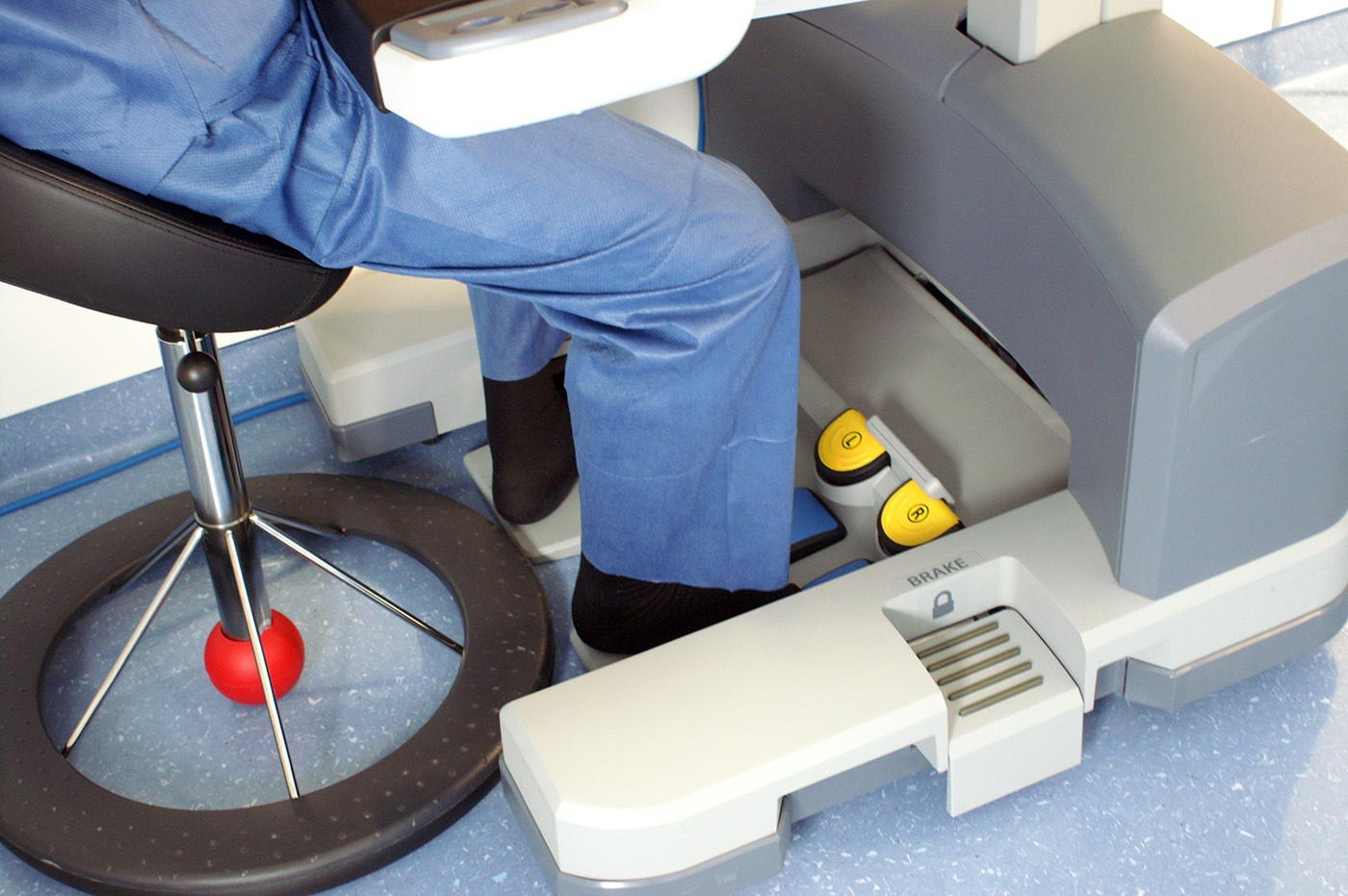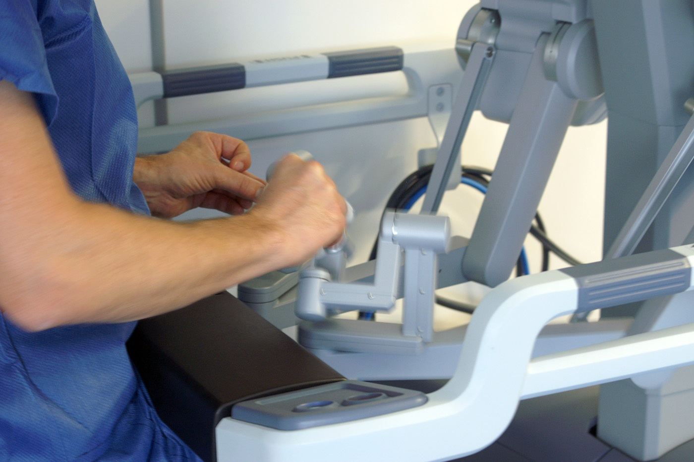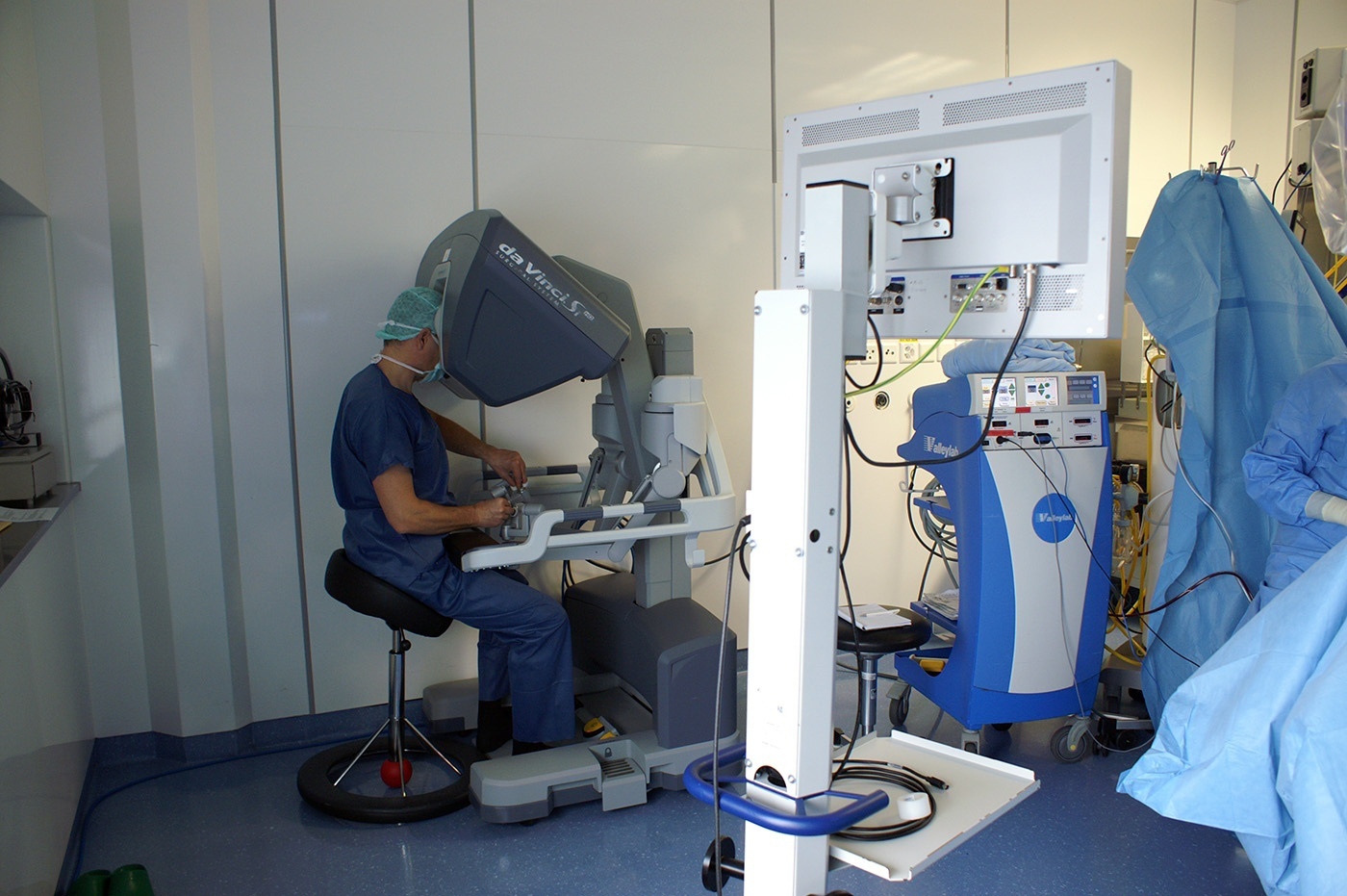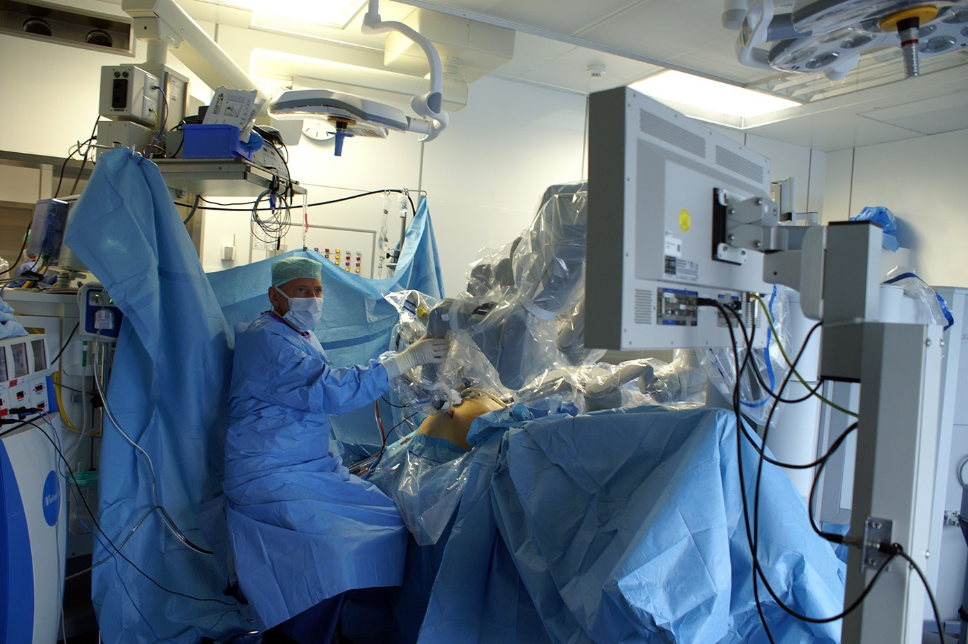 J’entre dans le bloc. La salle, pourtant de bonne taille, semble presque petite tellement il y a de gens, d’appareils et d’instruments. Je cherche un endroit où je ne gênerai pas, en prenant garde de ne rien toucher. «Tout ce qui est bleu est stérile, et tu ne dois en aucun cas y toucher, sans quoi nous devrions tout recommencer», m’explique une infirmière de bloc opératoire. Le patient est allongé sur la table d’opération, couvert et déjà sous anesthésie. Le robot Da-Vinci et la console opératoire prennent une place considérable.