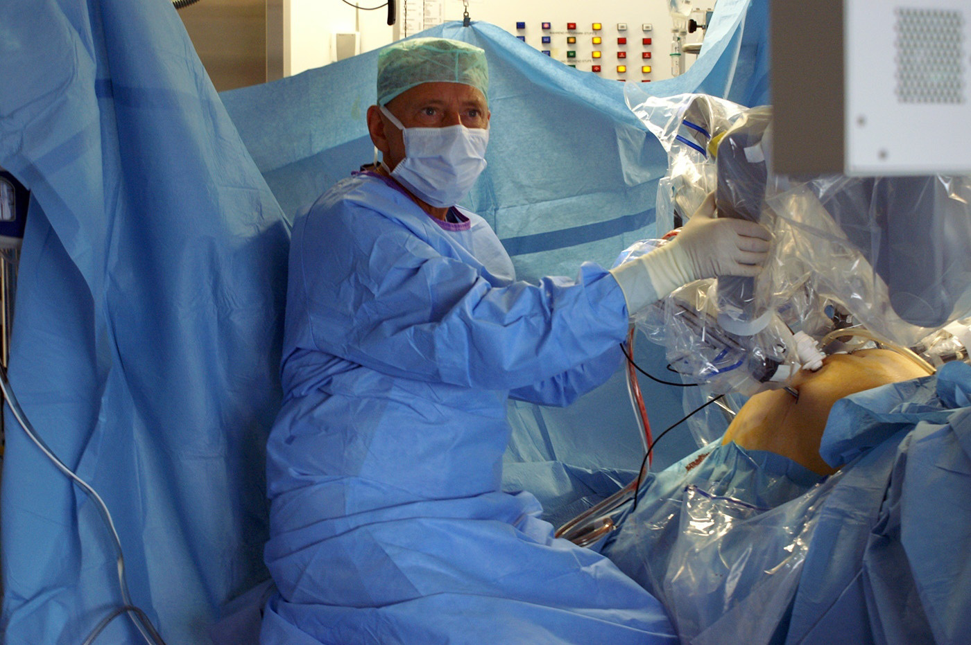 L’équipe compte huit personnes: les deux urologues, le Dr Martin Christian Schumacher et le Dr Werner Hochreiter, les anesthésistes et les équipes d’anesthésie et d’infirmier-ère-s de bloc. Pendant que les équipes d’anesthésie et du bloc se concentrent sur la préparation, le Dr Schumacher m’explique l’intervention. «La résection de la prostate dure entre deux et quatre heures selon les patients. L’équipe du bloc est spécialement formée à ce type d’interventions robotisées. Nous sommes deux urologues: l’un commande le robot depuis la console, l’autre se tient près du patient, près de la table d’opération».