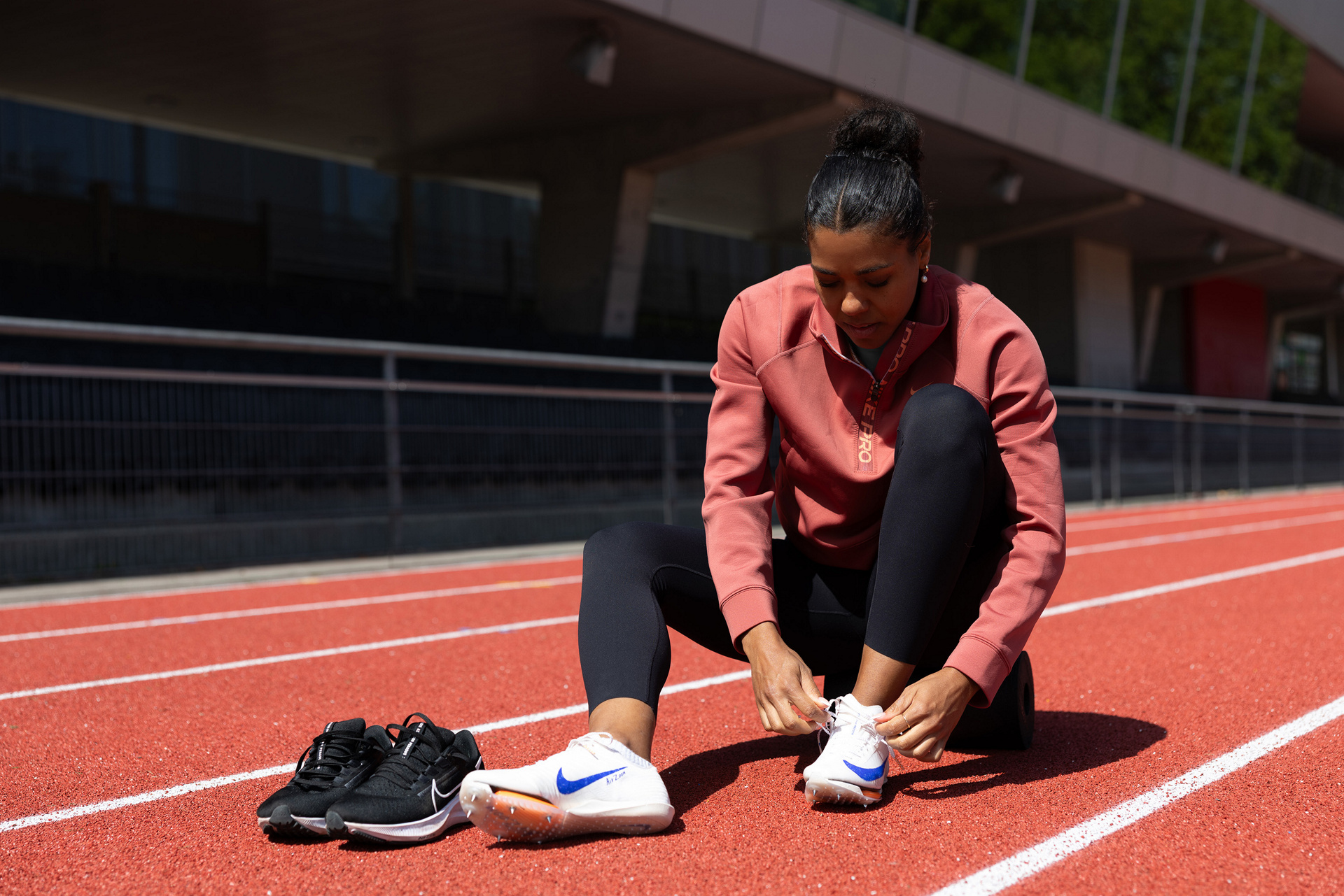 Ditaji Kambundji: Un bon échauffement commence par une course légère pour s’échauffer, mais aussi par une préparation ciblée du corps – par exemple via des exercices avec des balles ou des rouleaux pour relâcher les fascias et par des étirements, la mobilisation des muscles du tronc et d’autres éléments préparatoires. Le bon choix de chaussure de course est également important. On sous-estime souvent le temps qu’implique un échauffement complet. Chez nous, il faut parfois plus d’une heure avant d’être vraiment « prêtes à courir ». Je n’ai pas de rituel fixe, mais j’ai une routine claire. Mon échauffement se déroule toujours de la même manière.
